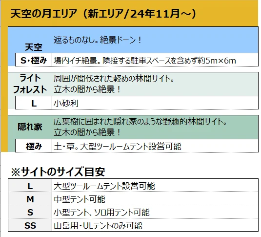 サイトの種類や広さの目安は下記画像を参考にしてください。